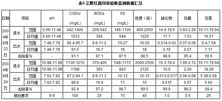 現將江蘇省環境監測中心環境監測站于2004年8月23日和24日驗收監測數據匯總整理成表6,監測時的廢水實際排放量約為1000t/d。