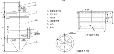 含塵氣體通過進風口切向進入過濾室空間,大顆粒的及凝聚的塵粒在離心力作用下,沿筒壁旋落入灰斗,小顆粒的粉塵彌散于過濾袋間空隙,子阿引風作用下,被濾袋阻留在濾袋外側,凈化后的空氣透過濾袋,經花板匯集于清潔室,再經引風機,最后排放到大氣中。