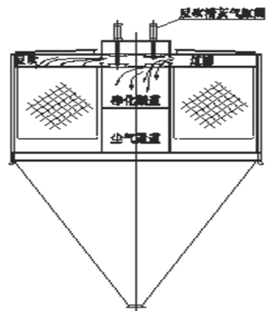 該除(chu)塵器(qi)的左右兩側過濾(lv)(lv)單元各5個(ge)(ge)室(shi),共10個(ge)(ge)室(shi)。中間上部(bu)(bu)為反吹清灰(hui)系統(tong);中部(bu)(bu)為凈化煙(yan)道(dao)和塵氣通道(dao);下部(bu)(bu)為漏(lou)斗、排灰(hui)閥,除(chu)塵器(qi)的濾(lv)(lv)袋(dai)(dai)為菱形(xing),由(you)29個(ge)(ge)菱形(xing)組成(cheng)一條(tiao)濾(lv)(lv)袋(dai)(dai),兩濾(lv)(lv)袋(dai)(dai)間排列間隙小,由(you)12條(tiao)菱形(xing)濾(lv)(lv)袋(dai)(dai)排列為一個(ge)(ge)過濾(lv)(lv)單元,類似蜂窩狀,亦可(ke)稱蜂窩狀袋(dai)(dai)式(shi)除(chu)塵器(qi)。