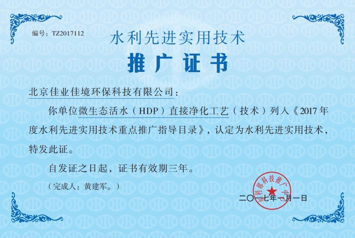 佳業佳境HDP技術獲 “2017年度水利部先進實用技術重點推廣”