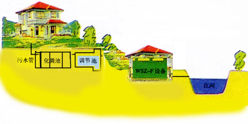 污水-調節池-潛污泵-豎流式初次沉淀池-三級浮動填料生化池-豎流式二次沉淀池-消毒池-過濾器-中水池-中水泵-回用