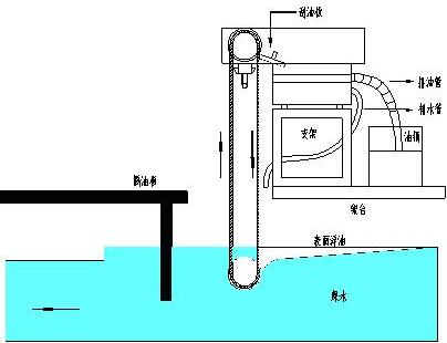 A&B表面浮油回收機工作原理是利用油水之間不同的重力和表面張力這些物理特性,使刮油帶在穿過水面時吸取浮油、重油等有機液體。當攜油帶繞過重輪向上離開液面時,液面上的油吸附在濾帶的表面進入二次分離池,經二次分離后進入收集器。