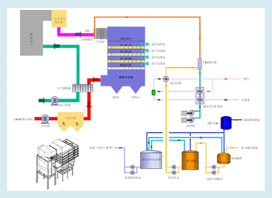 還原劑 (氨) 用罐裝卡車運輸,以液體形態儲存于氨罐中;液態氨在注入SCR 系統煙氣之前經由蒸發器蒸發氣化;氣化的氨和稀釋空氣混合,通過噴氨格柵噴入SCR反應器上游的煙氣中;充分混合后的還原劑和煙氣在SCR反應器中反應,將煙氣中的NOx還原成N2。