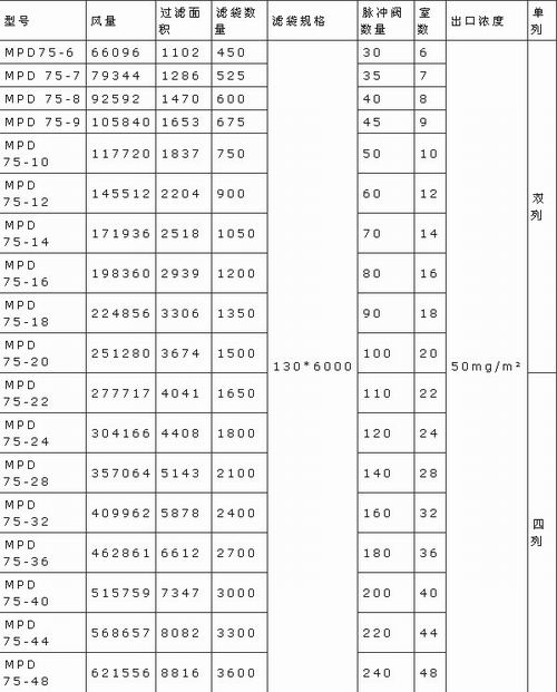 MPD長袋脈噴袋式除塵器技術參數: