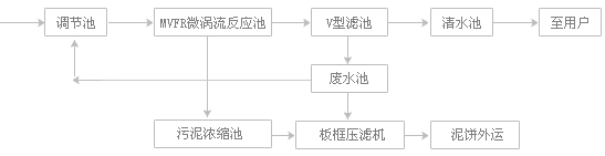 廢水(shui)(shui)經(jing)格(ge)柵攔(lan)截雜(za)物后進入(ru)調(diao)節池(chi),在池(chi)內設潛水(shui)(shui)攪拌機防止懸浮(fu)物沉淀(dian);采用提升泵提升到MVFR微渦流反應(ying)池(chi),在進水(shui)(shui)管上投加混凝(ning)劑(ji)和絮凝(ning)劑(ji),在MVFR微渦流反應(ying)池(chi)內反應(ying)沉淀(dian)后上清(qing)液重力流入(ru)V型濾池(chi)過濾,下部(bu)沉淀(dian)污泥經(jing)排泥泵輸送到污泥濃縮(suo)池(chi);V型濾池(chi)采用均質石(shi)英砂,出水(shui)(shui)進入(ru)清(qing)水(shui)(shui)池(chi)待用,反沖洗廢水(shui)(shui)回流至調(diao)節池(chi)重新處理;清(qing)水(shui)(shui)池(chi)水(shui)(shui)質已(yi)達標(biao)可直接回用于(yu)生產(chan),采用變頻器控制回用水(shui)(shui)泵轉速以達到恒(heng)壓(ya)供水(shui)(shui)目的,清(qing)水(shui)(shui)池(chi)超過警戒水(shui)(shui)位(wei)時將開啟外排閥門將用不完的水(shui)(shui)排放。濃縮(suo)池(chi)污泥經(jing)濃縮(suo)后送入(ru)板框壓(ya)濾機脫水(shui)(shui)。