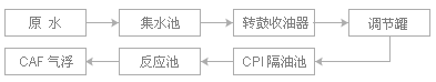 原水(shui)(shui)經(jing)(jing)格柵進入集水(shui)(shui)池,在(zai)集水(shui)(shui)池內設置轉鼓收油(you)器,去(qu)除大部分的浮油(you),再(zai)經(jing)(jing)泵(beng)提(ti)升到調(diao)節罐(guan),在(zai)罐(guan)中設有固定(ding)式的除油(you)堰(yan),調(diao)節罐(guan)調(diao)節水(shui)(shui)質水(shui)(shui)量(liang)(liang)后(hou),再(zai)經(jing)(jing) CPI 隔油(you)池除油(you)、反應池、 CAF 氣浮除去(qu)乳化油(you),該工藝可保(bao)證油(you)含量(liang)(liang) 500mg/l 的原水(shui)(shui)出水(shui)(shui)油(you)含量(liang)(liang)小于 20mg/l 。