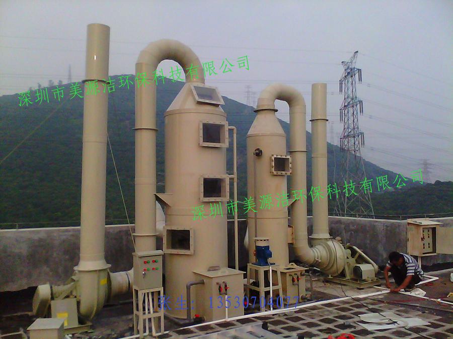 酸、堿性廢氣凈化工藝與設備。它具有結構簡單、能耗低、凈化效率高和適用范圍廣的特點,能有效去除氯化氫氣體(HCl)、氟化氫氣體(HF)、氨氣(NH3)、硫酸霧(H2SO4)、鉻酸(CrO3)、氰氫酸氣體(HCN)、堿蒸氣(NaOH)、硫化氫氣體(H2S)、福爾馬林(HCHO)等水溶性氣體。酸霧廢氣由風管引入凈化塔,經過填料層,廢氣與氫氧化鈉吸收液進行氣液兩相充分接觸吸收中和反應,酸霧廢氣經過酸霧凈化塔凈化后,再經除霧板脫水除霧后由風機排入大氣。吸收液在塔底經水泵增壓后在塔頂噴淋而下,最后回流至塔底循環使用。凈化后的酸霧廢氣達到廣東省地方排放標準的排放要求,低于國家排放標準