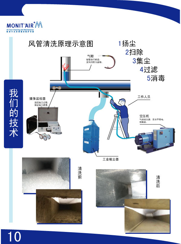可以徹底清潔到管道的任何角落, 每一個裝置都可以以最快的速度被徹底的清潔, 以最大的效率帶給您光潔如新的中央空調和一塵不染的新鮮的空氣。