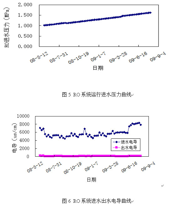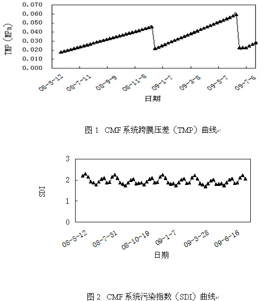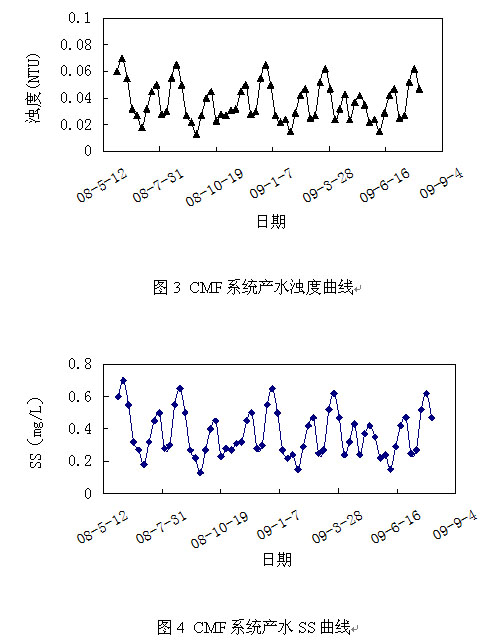 傳(chuan)統生化工(gong)藝(yi)(yi)處(chu)理(li)后,污水(shui)(shui)(shui)經絮凝沉淀,再進入CMF系(xi)(xi)統處(chu)理(li),出水(shui)(shui)(shui)直接回(hui)用于補充循環冷卻水(shui)(shui)(shui),CMF后接RO除(chu)鹽后產水(shui)(shui)(shui)用于高速線材生產線工(gong)藝(yi)(yi)用水(shui)(shui)(shui)。該項目由于進水(shui)(shui)(shui)為復雜的(de)混合污水(shui)(shui)(shui),水(shui)(shui)(shui)質波動較(jiao)大,需要(yao)根(gen)據(ju)水(shui)(shui)(shui)質變化情況對膜系(xi)(xi)統及時維護(hu)清洗,運(yun)行(xing)1年(nian)來,總體(ti)狀(zhuang)況良好(hao),實現了(le)復雜水(shui)(shui)(shui)體(ti)的(de)循環再利用。圖(tu)1-4為CMF系(xi)(xi)統的(de)運(yun)行(xing)數據(ju)圖(tu),圖(tu)5-6為RO系(xi)(xi)統的(de)運(yun)行(xing)數據(ju)圖(tu)。