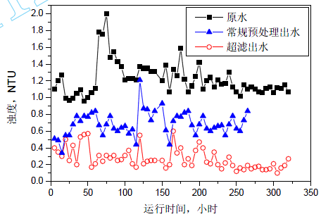 下圖顯示了常規預處理和超濾對濁度的去除效果比較。