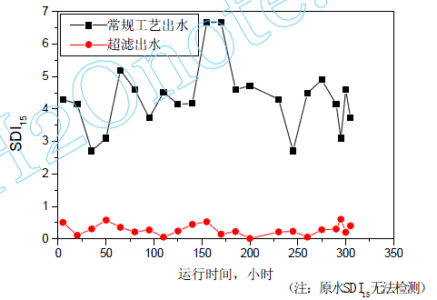 3. 試驗期間超濾產水的SDI15 在0.5以下,遠遠優于常規工藝。