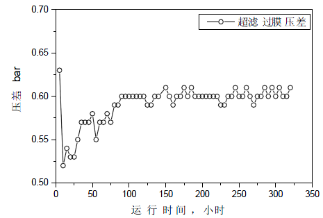 試驗期間在保持超濾產水量恒定的情況下,記錄了超濾進出水的壓差變化。如上圖所示,超濾投入運行后,在前80小時,膜兩側的壓差總體趨勢逐步上升,在隨后的200多小時時間里,壓差則趨于穩定。這一過程是水中的雜質在新的超濾膜表面積累并形成 “凝膠層”的過程。一旦凝膠層建立,膜通量的下降就趨于平緩,并逐步達到穩態。圖中的曲線恰當地反映了這一過程。表明在試驗期間膜的污堵情況十分輕微。