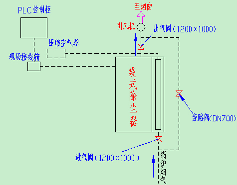 整個除塵系統包括三部分:①袋式除塵器系統;②旁路;③控制系統;