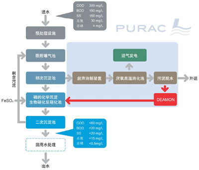 污水處理采用兩階段曝氣工藝,應用高效的深池射流曝氣系統,減少能量消耗。在泥處理中,利用超聲消解裝置對污泥進行預處理,使用高效的污泥厭氧高溫消解工藝,增加沼氣產量,減少干污泥量,沼氣燃燒產生的電能,可供污水處理廠使用。