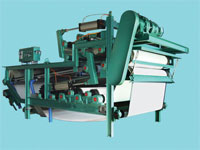 工作原理:經過絮凝的懸浮物廖(泥漿)在重力脫水段脫去大部分游離水,物料得到初步濃縮,然后經過卸料機構制上下濾帶之間,進入碶型區內進行預壓脫水,經過脫水輥脫水后,進入系列S形排列的壓輥壓榨脫水直至形成濾餅后卸料。在這過程中污泥受到由小到大的擠壓,剪切作用力,可脫去其中大部分游離水和部分毛細水分。