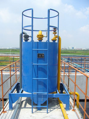 ---- 節能脈沖厭氧反應器由厭氧池、布水管、三相分離器、沼氣室、提升泵、脈沖發生器、發生器連接管、進水管、進氣管、出氣管、出水堰共同組成;其中,脈沖發生器安裝在厭氧池的頂部,在脈沖發生器的上端分別設有進水管、進氣管和出氣管,進水管直接與提升泵相連,進氣管與厭氧池內的沼氣室相連通,出氣管直通至厭氧池底部的布水管,出水堰設在厭氧池的頂部,三相分離器根據厭氧反應器的高度裝在其中上部。正常工作時,提升泵將水抽至脈沖反應器內,當水達到一定高度時,水會溢過連接管入口,開始注入厭氧池底部的布水管,此時,在脈沖發生器內形成一負壓,產生虹吸現象,在脈沖發生器水大量流入布水管,以增大布水管內部的向上推力,使厭氧池沉淀的懸浮污泥層均勻地翻動,在厭氧池內對有機物的有效反應,同時,污水、污物及沼氣則送至沼氣室,當脈沖發生器工作發生負壓時,沼氣室內的沼氣通過進氣管進入脈沖發生器,有效防止空氣進入厭氧池破壞內部無氧環境,保證了厭氧池內對污水有機物80-90%去除。