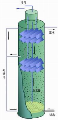 IC反應(ying)器相(xiang)似由2層UASB反應(ying)器串聯(lian)而(er)成。按(an)功能劃分,反應(ying)器由下而(er)上共分為(wei)5個區(qu)(qu):混合區(qu)(qu)、第1厭氧區(qu)(qu)、第2厭氧區(qu)(qu)、沉淀區(qu)(qu)和(he)氣(qi)液(ye)分離區(qu)(qu)。反應(ying)器主(zhu)要通過2層三(san)相(xiang)分離器來(lai)實現SRT>HRT,獲得(de)高污泥(ni)濃度;通過大量沼(zhao)氣(qi)和(he)內(nei)循(xun)環的劇烈擾動,使泥(ni)水充分接觸,獲得(de)良好的傳質效果。