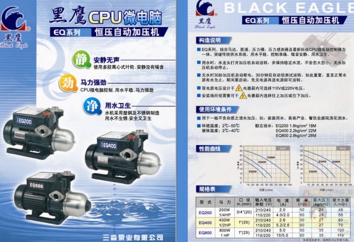 3、 最大揚程:EQ200 2.4kg/cm2 、EQ400 3.0kg/cm2、EQ800 3.5kg/cm2,口徑均為1英寸.