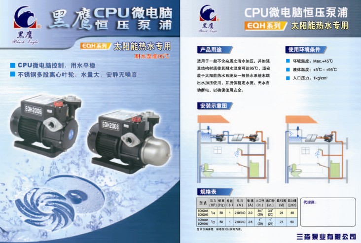 臺灣黑鷹EQH系列CPU微電腦全自動太陽能熱水增壓水泵