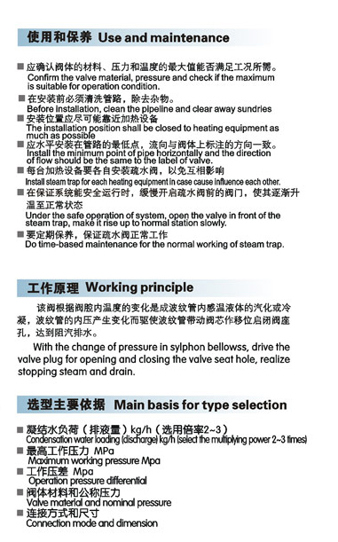 該閥根據腔內溫度的變化是成波紋管內感溫液體的汽化或冷凝,波紋管的內壓產生變化而驅使波紋管帶動閥芯做移位啟閉閥塞孔,達到租氣排水。該閥能充分利用熱能,特別適用于蒸汽伴熱管線,是低溫排水的環保型現熱疏不閥。