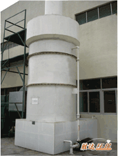 工藝流(liu)程:由通風控制系(xi)統(tong)引(yin)出的(de)有害氣(qi)體,經塔的(de)下部進入,在塔中,氣(qi)流(liu)自下而(er)上(shang)的(de)通過(guo)(guo)塔板與橫向(xiang)流(liu)動的(de)吸(xi)收(shou)液充分接(jie)觸,完成傳質(zhi)過(guo)(guo)程,清除氣(qi)體中的(de)有害物質(zhi),氣(qi)流(liu)經除霧器除霧后排出。吸(xi)收(shou)液是經過(guo)(guo)塔板,溢流(liu)堰,降液管,塔板,儲液槽,水泵循環使用的(de)。