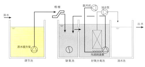 來源(yuan):上(shang)海申蘭環保有(you)限公司 閱(yue)讀(du):2394 更新時間:2011-05-11 15:39原理:膜生物反應器(MBR)系統是將膜分(fen)離(li)技術中(zhong)的(de)超微濾組件與污(wu)水(shui)生物處理中(zhong)的(de)生物反應器相互(hu)結合而開發(fa)出的(de)一種全新的(de)污(wu)水(shui)處理工藝。它利用(yong)膜分(fen)離(li)設(she)備將生化(hua)反應池中(zhong)的(de)活性污(wu)泥和(he)大分(fen)子有機物質截留住(zhu),省掉二沉池。