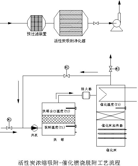 主要設備:催化燃燒脫附爐、活性碳濃縮吸附凈化裝置、吸附前處理器、吸附風機等。