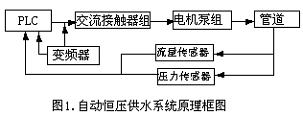 典型的自動恒壓供水系統的結構框圖如圖1所示;系統具有控制水泵出口總管壓力恒定、變流量供水功能,系統通過安裝在出水總管上的壓力傳感器、流量傳感器,實時將壓力、流量非電量信號轉換為電信號,輸入至可編程控制器(PLC)的輸入模塊,信號經CPU運算處理后與設定的信號進行比較運算,得出最佳的運行工況參數,由系統的輸出模塊輸出邏輯控制指令和變頻器的頻率設定值,控制泵站投運水泵的臺數及變量泵的運行工況,并實現對每臺水泵根據CPU指令實施軟啟動、軟切換及變頻運行。系統可根據用戶用水量的變化,自動確定泵組的水泵的循環運行,以提高系統的穩定性及供水的質量。