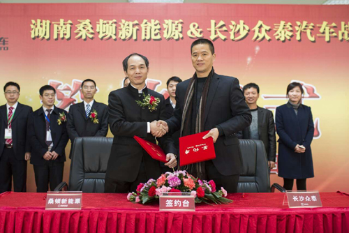 1月19日上午,湖南桑頓新能源有限公司與長沙眾泰汽車工業有限公司就“眾泰云100電池系統合作”簽署了戰略合作協議書,擬規劃于2015年底前向1萬臺眾泰云100新能源汽車提供動力電池系統。