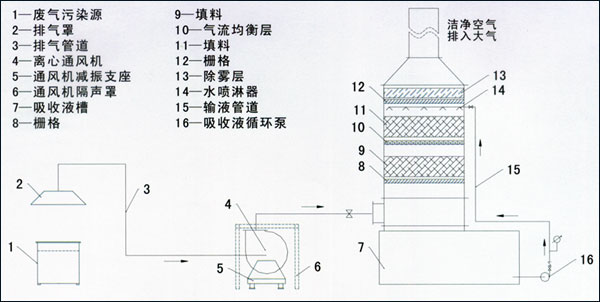 本設備(以立式為例)是屬于兩相逆流填料吸收塔。廢氣從塔體下方進氣口沿切線方向進入凈化塔,在通風機的動力作用下,迅速充滿進氣段空間,然后均勻地通過均流段上升到第一級填料吸收段。在填料的表面上,氣相中酸性物質與液相中堿性物質發生化學反應。反應生成物質多數為可溶性鹽類,隨吸收液流入下部儲液槽。
