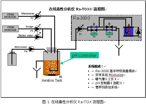 曝氣罐不斷地自動地填充活性污泥,同時加入廢水以達到最大的呼吸速率。分析儀連續從曝氣池中的污泥和廢水的混和樣送到呼吸模塊Ra-3000中,在呼吸模塊中采用獨特的單溶解氧傳感器測量呼吸模塊中樣品的溶解氧濃度。每一次測量是在2個相反的流動方向進行的。在固定的時間內(30秒),流過呼吸模塊的流向將相反一次。這2次的溶解氧濃度差值就是呼吸速率(mgO2/lh)。曝氣池中活性污泥的好氧速率、呼吸速率與其生命力有關,因而也體現了毒性作用的大小。如果工藝條件中呼吸速率只和污水中毒性混合物有關,那么呼吸速率的減少可以指示出毒性物質的影響。該毒性分析儀可以同時測量顯示:O2in、O2out、呼吸速率Ra、短時呼吸速率平均值Rashort、長時呼吸速率平均值Ralong和毒性抑制率%。毒性抑制率%=(Ra short-Ra long)/Ra long*100% 。
