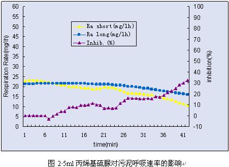 1、當新鮮的混合液進入測量槽,5分鐘之后,呼吸速率開始穩定, 40分鐘后,由儀器顯示圖中可以看到Ra線運行平穩,并一直保持在20mg/lh左右。由圖1可以看到,在加入毒性物質前,其Ra為21.3mg/lh,Ra short為22.6mg/lh,Ra long為21.6mg/lh,抑制率為0,在加入毒性物質丙烯基硫脲5ml后,污泥呼吸速率開始慢慢下降,5分鐘后,Ra為20.5 mg/lh,Ra short為20.8mg/lh,Ra long為21.7mg/lh,抑制率為4.4%;10分鐘后,Ra為19.3 mg/lh,Ra short為19.3mg/lh,Ra long為21.4mg/lh,抑制率為10%;20分鐘后,Ra為16.7 mg/lh,Ra short為16.5mg/lh,Ra long為19.5mg/lh,抑制率為15.6%;由此可以看到污泥呼吸速率緩慢下降,抑制率緩慢上升,最終達到報警值后報警。