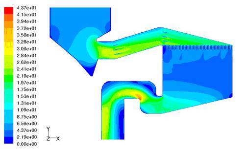 針對太倉(cang)發電廠SCR反應(ying)(ying)器現場(chang)布(bu)(bu)置(zhi)空間十分(fen)(fen)有(you)限的(de)(de)(de)(de)問題,充分(fen)(fen)發揮OI2-SCR核心技(ji)術的(de)(de)(de)(de)優(you)勢,對連接(jie)煙道(dao)的(de)(de)(de)(de)流(liu)體(ti)(ti)流(liu)動、混合擴(kuo)散(san)及傳熱傳質(zhi)過程(cheng)(cheng)進(jin)行數(shu)值模擬,以(yi)獲取有(you)益的(de)(de)(de)(de)參數(shu)為(wei)(wei)應(ying)(ying)用于工(gong)程(cheng)(cheng)。首先建立計算用實體(ti)(ti)模型,由于結構的(de)(de)(de)(de)對稱性(xing),分(fen)(fen)析中(zhong)僅(jin)對實際模型的(de)(de)(de)(de)一半進(jin)行了分(fen)(fen)析,圖2為(wei)(wei)與催(cui)化反應(ying)(ying)器連接(jie)煙道(dao)(反應(ying)(ying)器進(jin)、出口(kou)段)內流(liu)場(chang)分(fen)(fen)布(bu)(bu)圖。在工(gong)程(cheng)(cheng)中(zhong),合理的(de)(de)(de)(de)設置(zhi)導(dao)流(liu)板,以(yi)期達(da)到(dao)最佳(jia)的(de)(de)(de)(de)流(liu)場(chang)分(fen)(fen)布(bu)(bu),為(wei)(wei)催(cui)化反應(ying)(ying)提(ti)供充分(fen)(fen)的(de)(de)(de)(de)條(tiao)件。