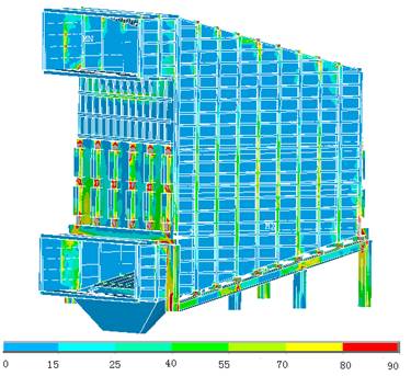 太倉發電廠煙氣脫硝系統為現(xian)(xian)場(chang)(chang)改造(zao),在現(xian)(xian)場(chang)(chang)重新構(gou)建的(de)(de)(de)(de)支承框架不可(ke)能有非常充足的(de)(de)(de)(de)承載能力,利用(yong)的(de)(de)(de)(de)空間也是有限的(de)(de)(de)(de)。故要(yao)求反(fan)應器作用(yong)在框架上(shang)的(de)(de)(de)(de)載荷應盡可(ke)能的(de)(de)(de)(de)小,而(er)且(qie)反(fan)應器的(de)(de)(de)(de)結構(gou)也要(yao)緊(jin)湊(cou)。