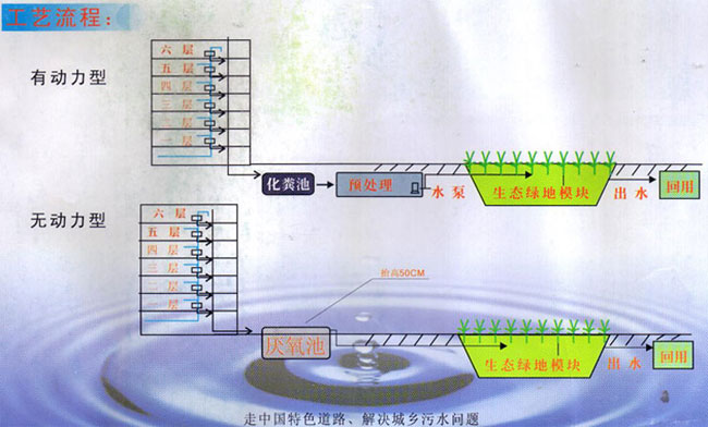 通過人工綠地構用微生物、植物、動物的生物鏈來凈化污水,應用簡單,小到一家一戶,大到上萬人的社區,只需利用部分綠地種植綠色植物,污水經植物的吸收、微生物降解、填料過濾以及離子交換等一系列過程,出水水質可達三級處理回用水標準;且所用能耗以太陽能、生物能為主,因此可最終實現污水的零排放,零費用運行。