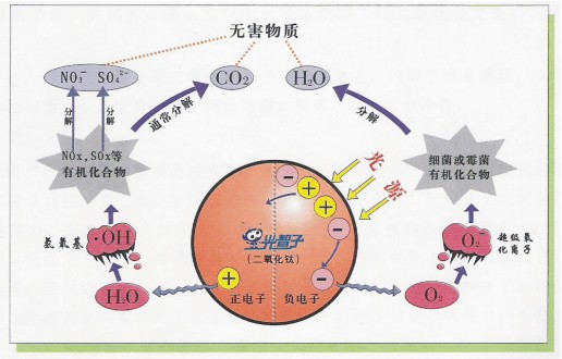 二(er)氧(yang)(yang)化鈦見(jian)光會(hui)產(chan)生正 、負電子(zi)與空氣當中的(de)(de)(de)水分(fen)子(zi)結合(he)產(chan)生氫(qing)氧(yang)(yang)自由基(ji),實(shi)踐證明,氫(qing)氧(yang)(yang)自由基(ji)具有(you)(you)強(qiang)(qiang)大(da)的(de)(de)(de)氧(yang)(yang)化分(fen)解能(neng)力(li),它(ta)能(neng)分(fen)解幾(ji)乎所(suo)有(you)(you)的(de)(de)(de)有(you)(you)機化合(he)物和一部分(fen)的(de)(de)(de)無機物,將它(ta)們分(fen)解成無害的(de)(de)(de)二(er)氧(yang)(yang)化碳和其他(ta)物質,而(er)負電子(zi)與空氣當中的(de)(de)(de)氧(yang)(yang)結合(he)會(hui)產(chan)生活性氧(yang)(yang),也就是(shi)超級(ji)氧(yang)(yang)化離(li)子(zi),超級(ji)氧(yang)(yang)化離(li)子(zi)也具有(you)(you)很強(qiang)(qiang)的(de)(de)(de)氧(yang)(yang)化分(fen)解能(neng)力(li),它(ta)可以(yi)破壞細(xi)菌 、霉菌,這些有(you)(you)機物的(de)(de)(de)細(xi)胞膜(mo),固化病毒的(de)(de)(de)蛋白(bai)質,在(zai)殺(sha)菌的(de)(de)(de)同時還(huan)能(neng)分(fen)解細(xi)菌尸(shi)體(ti)上釋放出(chu)的(de)(de)(de)有(you)(you)害復(fu)合(he)物 。