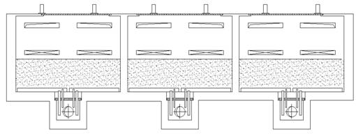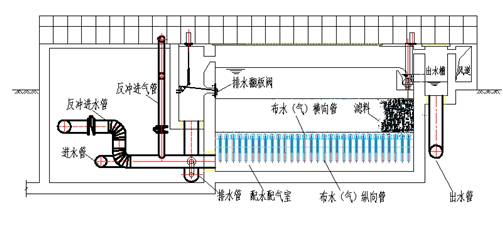 翻板濾池采用新型的布水布氣系統,在底板上、下形成兩個均勻的氣墊層,從而保證布水、布氣均勻,避免氣水分配出現脈沖現象,影響反沖洗的效果。