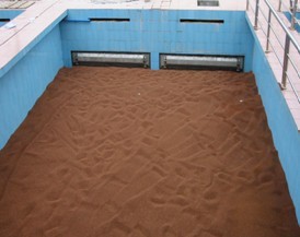 翻板濾池下有級配的礫石承托支,濾料一般不會從濾池底部流失。反沖洗時反沖洗水的強度高(15-16L/m2.s)、濾料的膨脹率較大(25-30%),若對一般濾料比重較輕的顆粒活性炭、陶粒等濾料易于從排水槽流失。但對于翻板濾池來說,采用閉池反沖洗的工藝,排水閥板是在反沖洗結束,濾料沉降一定時間后再逐步開啟,所以避免了流失。