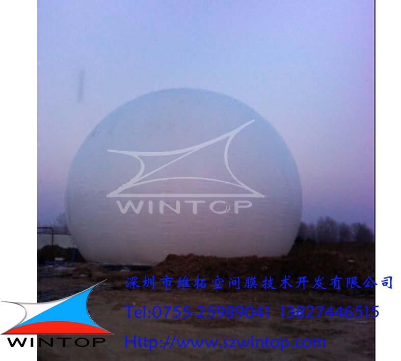 雙膜生物儲氣罐的底膜主要用于密封基礎防止氣體從基礎流走,內膜為球形的一部分跟底膜連接形成一個空間用于儲存氣 體。外膜為一個比內膜稍微大一些的同形狀的球形組成,邊界與內膜及底膜的邊界連接,在內外膜中間形成一個空間,這個空間作為調壓室裝調壓空氣。利用氣泵注入空氣或者放出空氣從而進行調壓和穩定外膜結構。