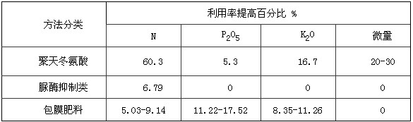 據研究表明,聚天冬氨酸可提高氮肥利用率60.3%、磷肥5.3%、鉀肥16.7%,與其他提高化肥利用率方法的比較,其效果如表1所示。