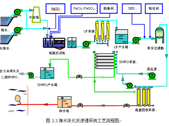 圖2-3為海水淡化反滲透系統工藝流程圖。工廠冷卻塔使用海水作為冷卻水,冬季水溫較低時,海水淡化系統原水為經過冷卻塔熱交換后的排出水,不管是海水還是地表水都進入混凝池處理,根據實際需要,可以對原水水源進行切換。FeCl3和聚合FeSO4作為絮凝劑,陰離子聚合物用作助凝劑,0.3-1.0mg/L有效氯的次氯酸鈉投入沉淀池作為殺菌劑,以控制微生物的繁殖。混凝沉淀池出水供給超濾系統,超濾作為反滲透的預處理。RO進水投加阻垢劑,同時投加亞硫酸氫鈉還原氧化劑余氯等。一級SWRO系統35%產水作為二級BWRO進水進入深度脫鹽處理后再進入離子交換系統,其最終超純水作為鍋爐補給水。