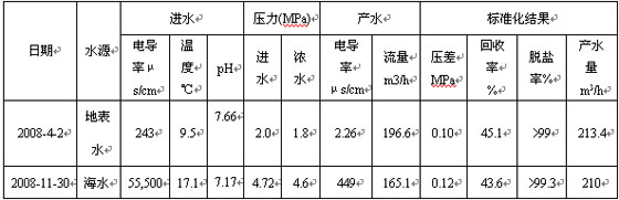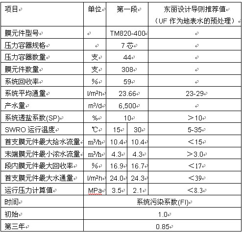 由于原水需要在海水和地表水之間切換,但是SWRO系統設計是按海水淡化系統進行設計,因此,在進行地表水處理運行時,選擇合適的操作參數非常重要。下表2-3列出了單列SWRO運行地表水時可選的技術合理的操作參數。