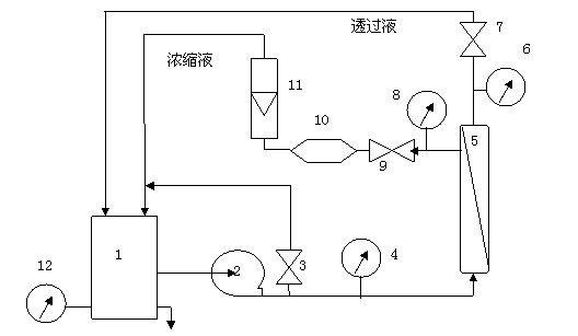 TGMF1904-3型中試陶瓷膜(mo)分(fen)離(li)設備由(you)循環罐1、增壓(ya)(ya)(ya)泵2、旁(pang)通閥(fa)3、進組(zu)(zu)件壓(ya)(ya)(ya)力(li)表4、膜(mo)組(zu)(zu)件5、透過液(ye)壓(ya)(ya)(ya)力(li)表6、透過液(ye)調壓(ya)(ya)(ya)閥(fa)7、出組(zu)(zu)件壓(ya)(ya)(ya)力(li)表8、調節閥(fa)9、換熱器(qi)10、濃(nong)縮液(ye)流量計(ji)11、溫度(du)表12和框架、電器(qi)控制組(zu)(zu)成,其原(yuan)理圖如(ru)下: