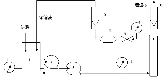 JNF4040L-1型膜分離設備由循環罐1、增壓泵2、高壓泵3、進組件壓力表4、膜組件5、透過液流量計6、出組件壓力表7、調節閥8、換熱器9、濃縮液流量計10、溫度表11和框架、電器變頻控制組成,其原理圖如下: