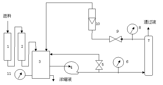 JUF1812L-1型多功能膜分離設備由石英砂過濾1、活性炭吸附過濾2、緩沖平衡罐水箱3、多級離心泵4、旁通閥5、進組件壓力表6、膜組件7、出組件壓力表8、調節閥9、流量計10、溫度表11和框架、電器控制組成,其原理圖如下: