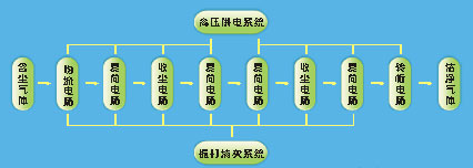含塵氣體進入電除塵器進風口后,首先經過兩級均流電場,均流電場由荷電極和收塵極組成。煙氣通過該區域,在達到氣流均布的同時,使粉塵荷電,荷電粉塵的一部分被收塵極捕集,而其余部分成為荷電粉塵繼續前行。均流電場有凝聚、荷電、收塵、均流等四種功能。均流電極裝有振打清灰系統。在五區電除塵器中,原來的三個電場由間隔串聯的三個復荷電場和三個收塵電場所取代,粉塵均勻而充分荷電的機會增多,因此增加了除塵的幾率。為了使電場區的整體電場強度提高,在第三電場內(或二、三電場內)裝有輔助電極,粉塵在此得到較高的趨進速度。為了進一步降低粉塵出口排放濃度,在第三電場的出口側裝有轉板電場,荷電粉塵直接被轉板收塵極捕獲,轉板收塵極上裝有不產生二次飛揚的清灰裝置。經過上述疊加、充分、強化的收塵過程,五區電除塵技術可使出口排放濃度比普通電除塵器有明顯降低。其工作流程如下: