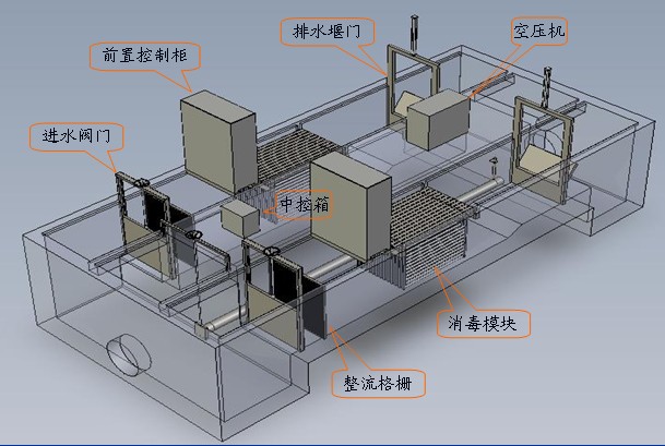 ①閘門 ②整流格柵 ③消毒模塊組 ④前置控制柜 ⑤中央控制柜 ⑥空氣壓縮機組件