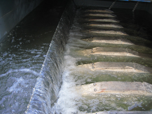 (2)設計新穎(ying),耐沖擊(ji)負(fu)(fu)荷。濾(lv)布轉盤過(guo)濾(lv)器相(xiang)當于(yu)是(shi)濾(lv)池(chi)及沉(chen)淀池(chi)的(de)結合,具有(you)排泥(ni)的(de)功能(neng)。顆粒大(da)的(de)污泥(ni)直接沉(chen)淀到(dao)斗(dou)形池(chi)底,不會堵塞濾(lv)布,即(ji)不像(xiang)普(pu)通(tong)濾(lv)池(chi):所有(you)的(de)懸(xuan)(xuan)(xuan)浮(fu)物(SS)都(dou)必(bi)須(xu)經(jing)過(guo)濾(lv)料(liao)。因此過(guo)濾(lv)周期(qi)長,清洗間隔長,而且(qie)可承(cheng)受(shou)的(de)水(shui)力負(fu)(fu)荷及污泥(ni)負(fu)(fu)荷也遠(yuan)遠(yuan)大(da)于(yu)常規砂濾(lv)池(chi),懸(xuan)(xuan)(xuan)浮(fu)物(SS)負(fu)(fu)荷相(xiang)當于(yu)普(pu)通(tong)砂濾(lv)池(chi)的(de)1.5倍,濾(lv)速比(bi)普(pu)通(tong)濾(lv)池(chi)增加50%。因此濾(lv)布轉盤過(guo)濾(lv)器更耐高懸(xuan)(xuan)(xuan)浮(fu)物濃度和(he)大(da)顆粒懸(xuan)(xuan)(xuan)浮(fu)物的(de)沖擊(ji)。