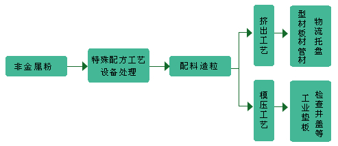 本工藝技術關鍵在于根據材料成分結構特征分別實行活化工藝及特殊處理,使其達到相關工藝及安全標準,從而實現非金屬材料的完全利用。經特殊工藝處理后的非金屬粉末,可直接作為塑膠填充改性材料及活性粉體材料使用,具有較好的使用價值。可以生產物流托盤、工業墊板、室外景觀材料、市政工程用排污管道、檢查井蓋等產品。