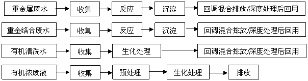 生產車間各(ge)廢水(shui)分(fen)(fen)開引入各(ge)調勻池,經(jing)還原或油水(shui)分(fen)(fen)離等處(chu)(chu)理(li)(li),沉(chen)淀(dian)后經(jing)過(guo)(guo)(guo)微(wei)過(guo)(guo)(guo)濾(lv)(lv)器、超濾(lv)(lv)器、納濾(lv)(lv)器等預(yu)處(chu)(chu)理(li)(li)過(guo)(guo)(guo)濾(lv)(lv),再(zai)經(jing)過(guo)(guo)(guo)二(er)級反滲透系統(tong),其出水(shui)水(shui)質即(ji)可(ke)(ke)達(da)到電導率小于20μs/cm2,可(ke)(ke)回用至(zhi)車間作生產用水(shui);沉(chen)淀(dian)池污泥脫水(shui)后委托(tuo)有處(chu)(chu)理(li)(li)資質的環保(bao)公司處(chu)(chu)理(li)(li);高COD廢水(shui)及第一(yi)級反滲透系之濃水(shui)經(jing)廢水(shui)處(chu)(chu)理(li)(li)系統(tong)達(da)標(biao)排(pai)放。
